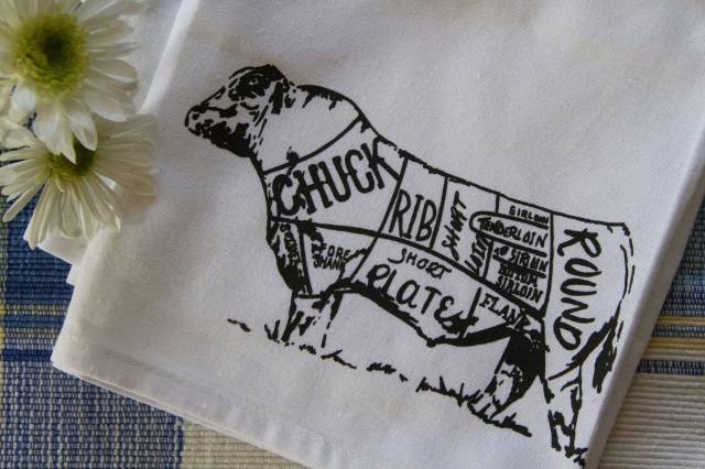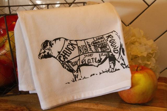 This tea towel is the perfect addition to your ranch or farmhouse style. Not only is it an accurate representation of the cuts of beef but it is a useable piece of art drawn by Michelle! And her model? Beartooth, a bull we adore here at Weber Land and Cattle.